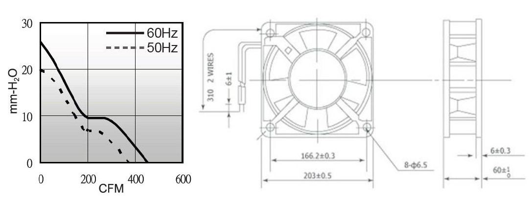 | 型号 | B/S | V | HZ | W | RPM | m3/min | CFM | mm-H2O | In-H2O | dba |
