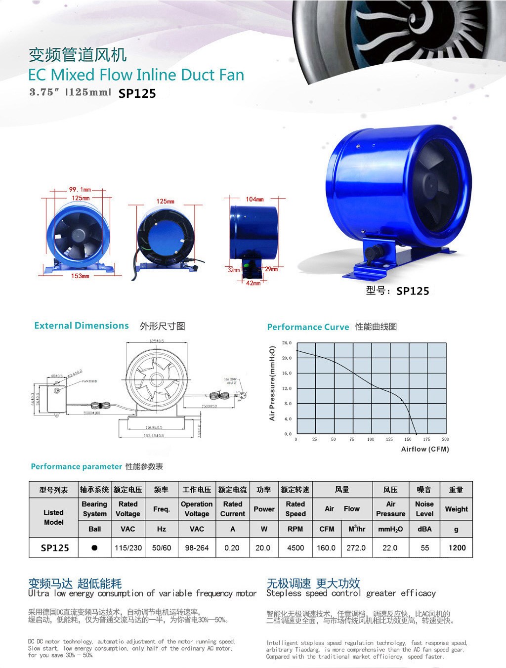 SP125管道风机产品用途:适用范围广,风量范围为273 m?/h,适用住宅、网吧、餐厅、KTV、办公室、酒店、棋牌室、健身会所等各种需要通风换气的环境; 灵活多用:机子可多角度、方位安装,可组合成多种形式新风系统; 优质电机:EC变频电机 无极调速高性能双滚珠轴承电机,电机自带过载保护器;