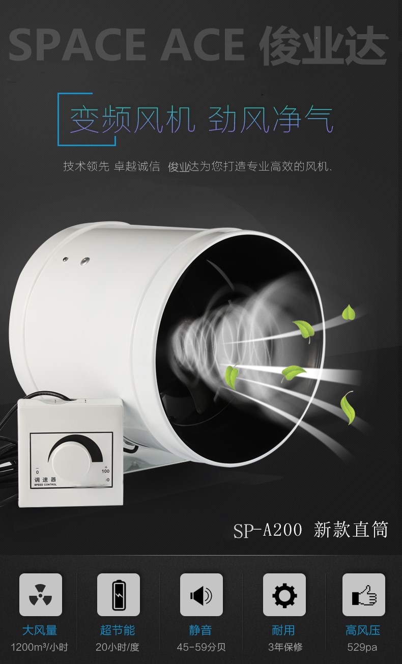 SP200管道风机新款产品用途:适用范围广,风量范围为1200 m3/h,适用住宅、网吧、餐厅、KTV、办公室、酒店、棋牌室、健身会所等各种需要通风换气的环境; 灵活多用:机子可多角度、方位安装,可组合成多种形式新风系统; 优质电机:EC变频电机 无极调速高性能双滚珠轴承电机,电机自带过载保护器;
