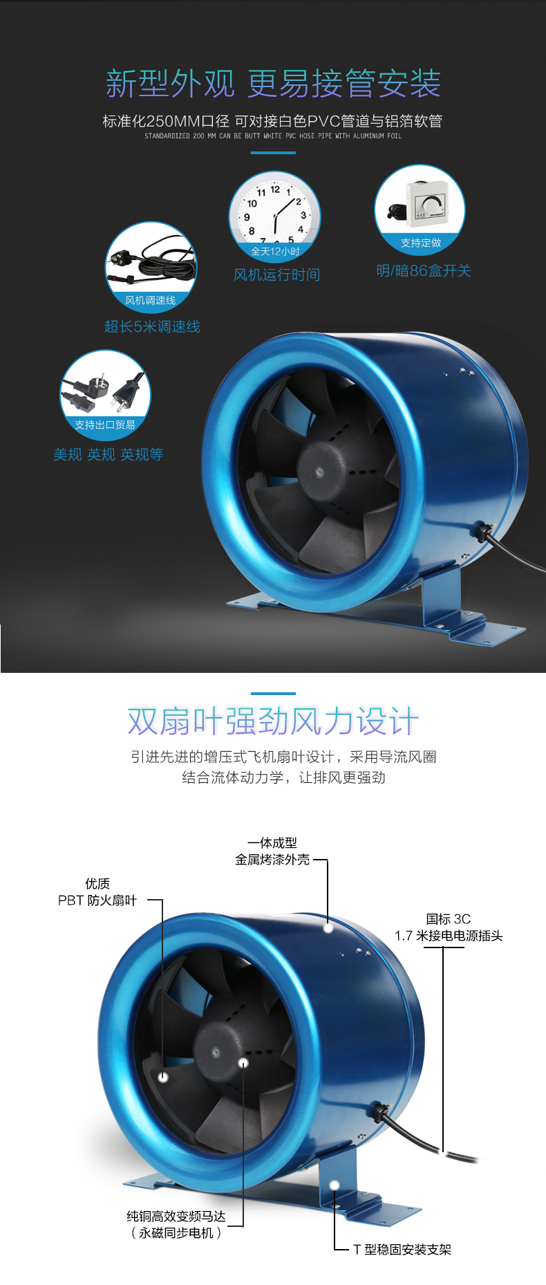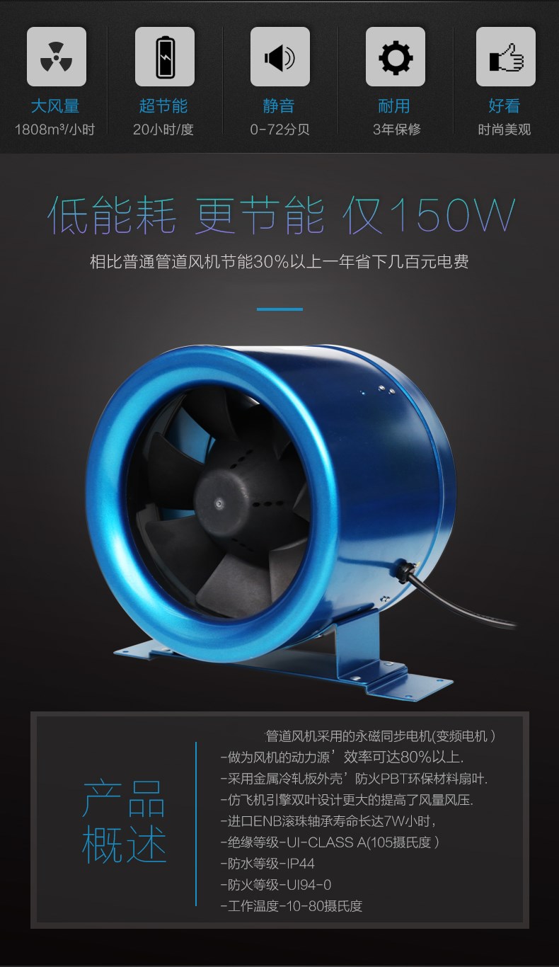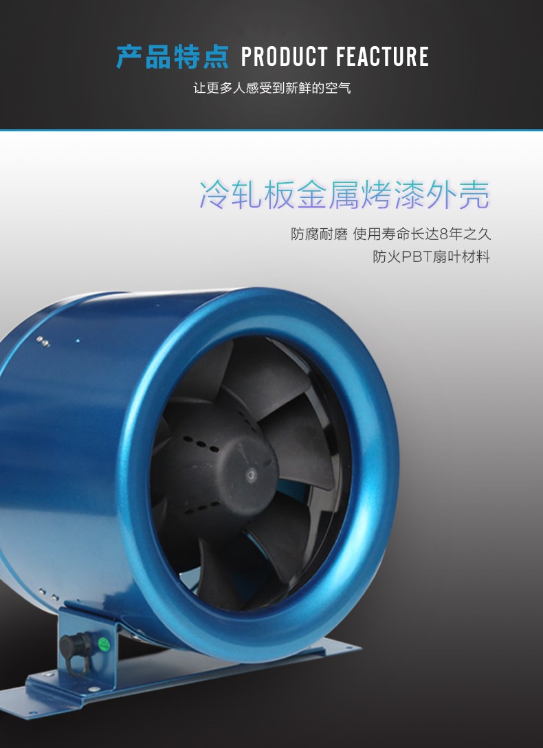 SP250管道风机产品特性:以圆形管道风机为例: 圆形管道风机采用机翼形后倾叶轮,高速运转时将气体流体力学发挥到极致,因此能效比非常高,可以达到80%,也就是说以最小的电机 功率输送最大的风力,这是普通前倾离心风机所不能达到的效果。因此管道风机既节能又大风。超高的风压可以接几十米的管道集中通风,管道风机主要特点 就是压力大。取代了传统的通风设备。风机无振动,动平衡值小于0.17g,只有这样的标准值才能保证风机的优越品质,进口金属外壳配套或PBT环保防火材料 .按照机翼型灌注而成,其特点是刚性强、耐高温、环保、风量大、而且可以一定程度上减少噪音。