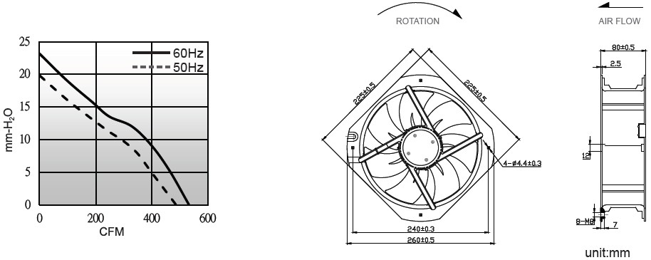 | 型号 | B/S | V | HZ | W | RPM | m3/min | CFM | mm-H2O | In-H2O | dba |