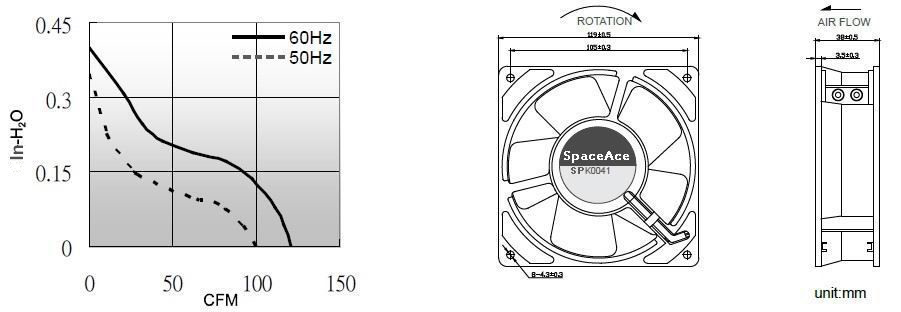 | 型号 | B/S | V | HZ | W | RPM | m3/min | CFM | mm-H2O | In-H2O | dba |